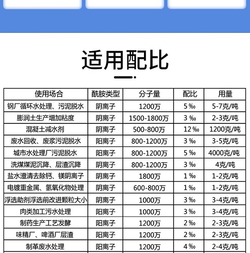 用于以江河作為水源的自來水廠的水處理絮凝劑,用量少,效果好,尤其是無機絮凝劑復配使用效果好。因為陽離子聚丙烯酰胺是陽離子單體和丙烯酰胺共聚而成的線型高分子聚合物,具有脫水 吸附 除濁 粘合等功能。更主要的是陽離子聚丙烯酰胺還可以常用到活化污泥法處理,具有脫水效率高的 性能。